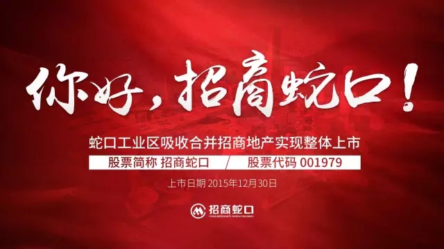 2015年12月30日,招商蛇口工业区吸收合并招商地产即“招商蛇口”上市敲钟仪式在深交所隆重举行,新公司全称为招商局蛇口工业区控股股份有限公司,股票代码为001979。历经9个月,资本市场史无前例的重大资产重组终于尘埃落定。
