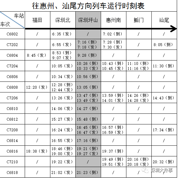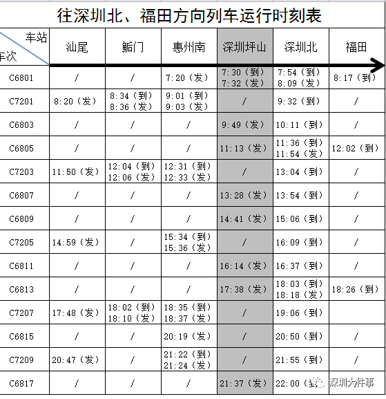 自2017年1月5日起,福田站将开行至惠州南站、深圳坪山的城际列车,深圳北站将开行至惠州南站、汕尾站的城际列车。