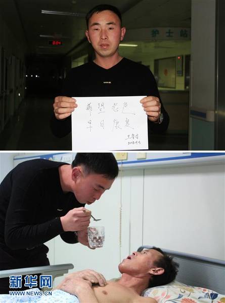 2016年11月,王鲁鲁的父亲在一场车祸后右小腿截肢,已经在医院住了40多天。新的一年王鲁鲁写下的心愿是“希望老爸早日康复。”(上图,2017年1月1日摄);2016年12月31日晚,在山东滨州医学院附属医院,王鲁鲁给躺在病床上的父亲喂水(下图)。跨年夜,有一群人不能与家人共进晚餐,不能与朋友跨年狂欢,他们或在工作岗位上默默无闻地坚守着,或在自己挚爱的亲人旁守护着。这是一群“小人物”,他们做着平凡的工作,过着平凡的生活,在新的一年里,他们有着自己的梦想。新华社发(袁帅摄)