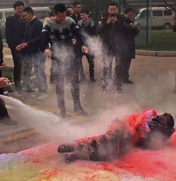 2016年12月31日,陕西西安市曲江一酒店里,礼现场新郎被亲朋好友“整惨”了,对于这种婚闹,在他们当地也是一种特别的祝福。图为新郎双脚被透明胶带捆住倒在地上,浑身被喷满了酱油醋、红墨水,此时众好友拿着灭火器干粉正在喷他。