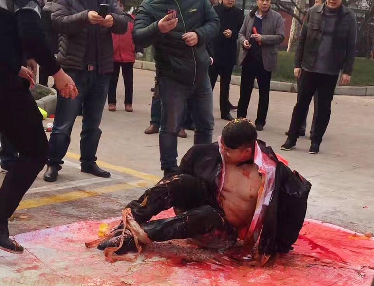 2016年12月31日,陕西西安市曲江一酒店里,礼现场新郎被亲朋好友“整惨”了,对于这种婚闹,在他们当地也是一种特别的祝福。图为新郎双脚被透明胶带捆住倒在地上,浑身被喷满了酱油醋、红墨水,此时众好友拿着灭火器干粉正在喷他。