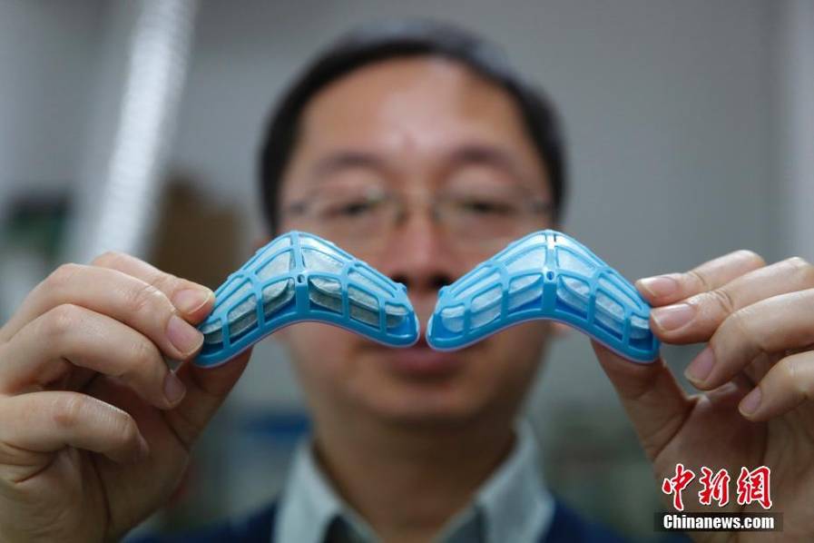 图为刘勇教授展示使用前后鼻罩滤芯。