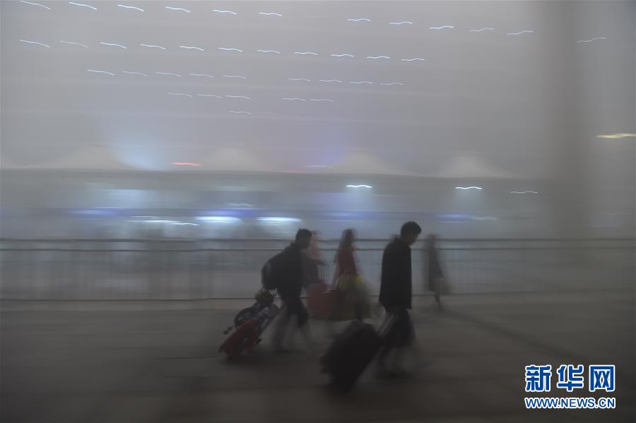 2017年1月3日,在安徽合肥火车站,浓雾中的旅客步履匆匆。新华社发(杨晓原 摄)