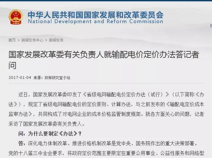国家发展改革委有关负责人就输配电价定价办法答记者问:“降成本”是供给侧结构性改革五大任务之一,也是推进电力体制改革的重要内容。《办法》遵循了“着力建机制、合理降成本”的理念,在建立科学、规范、透明的输配电价监管机制的同时,努力推动降低工商企业用电成本。 2015年以来,通过输配电价改革、实施煤电价格联动、推进电力市场化交易等方式综合施策,已累计降低用电成本1800亿元以上。