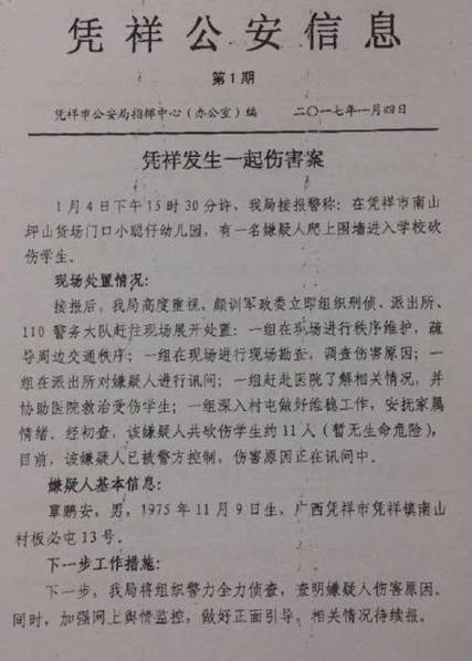 2017年1月4日,下午15点30分左右,广西凭祥市一男子翻越围墙进入当地一家名为小聪仔的幼儿园,砍伤11名幼儿。目前,嫌疑人已被警方抓获,受伤幼儿被送往医院救治,暂无生命危险。警方已对案件原因展开调查。