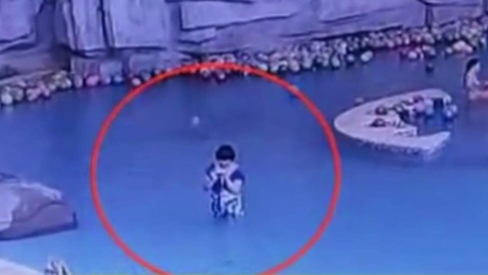 监控视频显示:事发时,肖女士的孩子从池子的一边朝另一边走,没走多久就开始挣扎。然而,肖女士就站在距离孩子大约三四米远的地方。但是当时她是背对着孩子玩手机,并没有发现异常。孩子随后挣扎了约三分多钟之后,慢慢沉入水底。出事时深水池内虽有七八名游客,但离孩子较远,都没有注意到孩子。图为孩子几乎被全部没入水面。