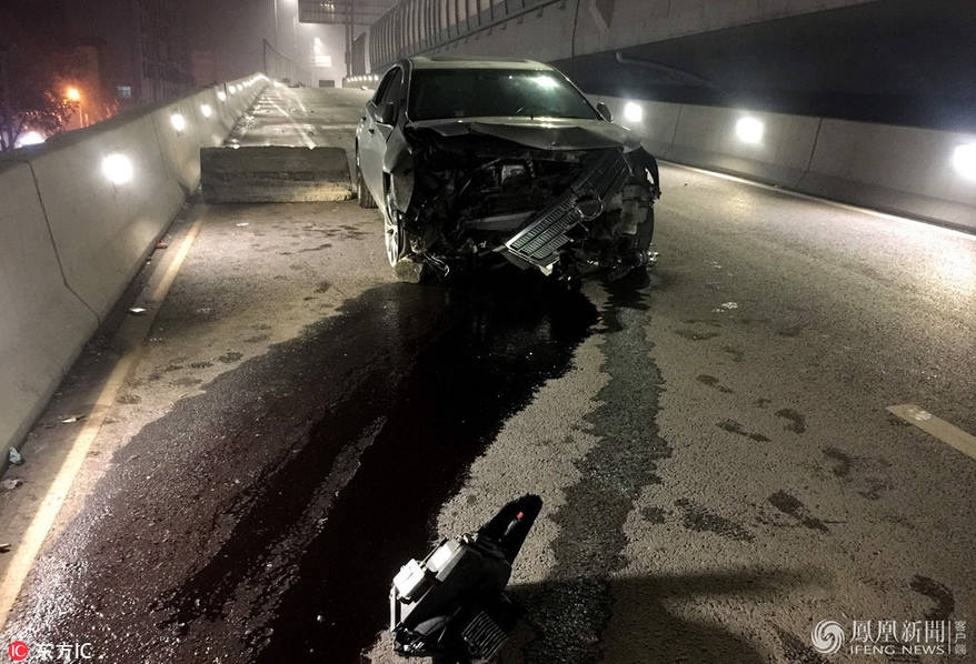 2017年1月4日凌晨,郑州市陇海快速高架桥紫荆山路下桥口处,一辆凯迪拉克轿车将封闭下桥口的隔离石墩撞飞约50米远。