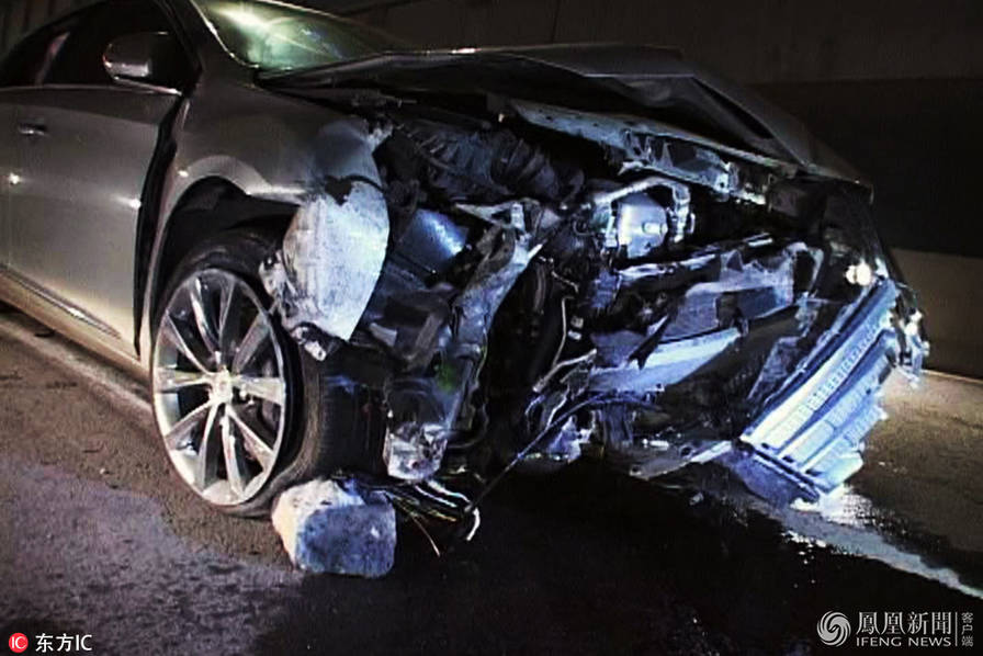 事发后,卡迪拉克轿车停在下桥口约50米远的匝道中,因强烈的撞击,轿车车头面目全非,车厢内所有安全气囊打开,车后到处散落着粉碎的水泥块以及变形的汽车零件。