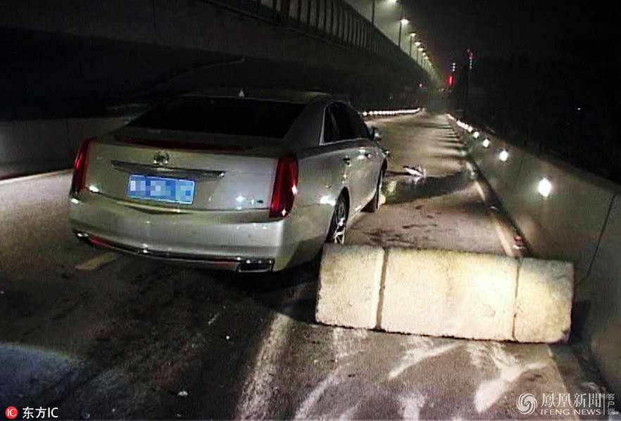 2017年1月4日凌晨,郑州市陇海快速高架桥紫荆山路下桥口处,一辆凯迪拉克轿车将封闭下桥口的隔离石墩撞飞约50米远。