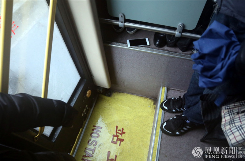 在1月5日早晨的行动中队员们在宝山和浦东当场抓获4名扒窃嫌疑人。图为扒窃嫌疑人行窃败露后丢弃在公交车厢中门处的手机。