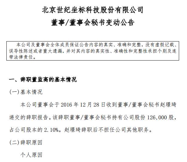 2016年的最后一个交易日,新三板挂牌公司世纪坐标(835131)发布了该年度的最后三则公告,均与人事变动有关。其中一则公告显示,公司董事会秘书于2016年12月28日向公司递交了辞职报告,这也是根据现有资料可查的2016年度最后一份董秘离职公告。