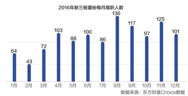 据Choice统计数据显示,2016年12月,有101位董秘离职,有的是直接离开公司,也有的继续在公司专注于其他岗位的工作。记者进一步梳理发现,2016年的新三板市场,随着挂牌企业数量突破万家再创新高,董秘离职潮也是一浪高过一浪,全年共有1132位董秘离职,约占该年末新三板挂牌公司总数的11%!