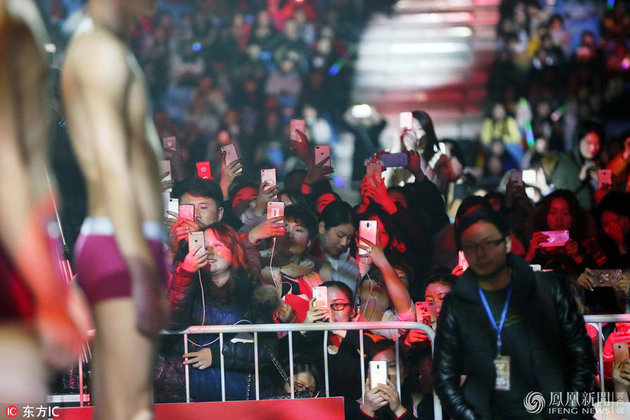 2017年1月7日,安徽合肥,一家内衣品牌年会在合肥体育中心举行。当男模特们现场实体展示内衣时,台下女观众热情瞬间高涨,争相围观拍照。