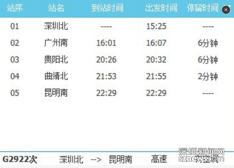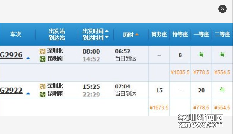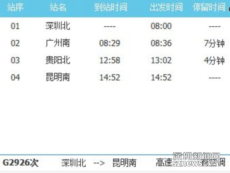 市民可乘坐G2926、G2922从深圳北到昆明南,最快只需6小时52分,单程最低票价554.5元,其中G2926途经广州南/贵阳北/昆明南站点,G2922在此基础上增加曲靖北这一站点。