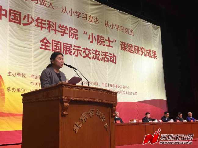 南山实验教育集团南头小学邓玉琳老师,也由深圳少年科学院推荐,作为全国唯一优秀辅导教师代表,在表彰大会上做了主题发言,与在坐的约二千名参加小院士评选活动的全国辅导老师和小院士、预备小院士、小研究员们,进行了经验分享与交流。