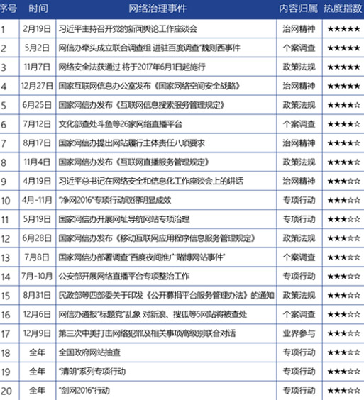 第四,践行依法治网,加强顶层设计。在依法治国背景下,“依法治网”业已成为一种新趋势。2016年各部门出台了若干网络治理的法律法规或规章制度,解决了治网主体和法律依据的问题,划清了“禁止性规范”与“义务性规范”的边界,有效确保了网络行为的良性发展。