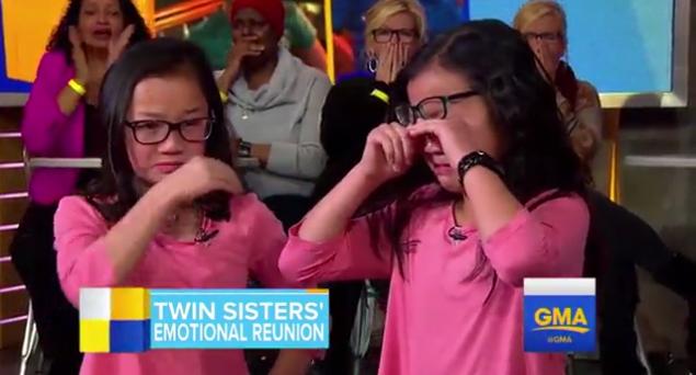 被2个美国家庭收养的中国孪生姐妹首次见面