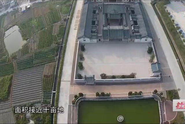 记者通过航拍,观察到这个豪华的住宅,整体呈长方形格局,面积接近十亩。类似四合院,中间是紧挨着的四套房屋,四周被墙体所包围。而在围墙的外面,被挖了一个长方形的人工水池。通过卫星地图显示,整个豪宅正好处于一片农田的位置。