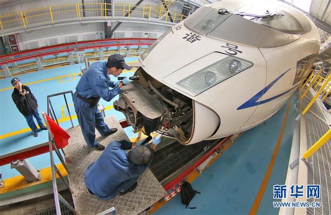 1月12日,在济南铁路局青岛动车段,地勤机械师对动车自动车钩进行检查。