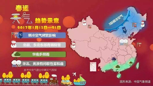 新华网北京1月17日电 2017年春运已正式拉开帷幕,天气对春节回家及出行旅游影响较大,今年春节正值冬季后期,是寒潮、低温、雨雪、冰冻、大风、雾和霾等天气的高发期。选择春节期间旅游探亲的公众需注意什么?气象部门为保障春运做了哪些工作?针对这些问题,1月13日,中国气象局网站联合国家旅游局及新华网,邀请旅游专家、气象专家一起来聊聊春运出行旅游的攻略和气象部门做的那些事儿。