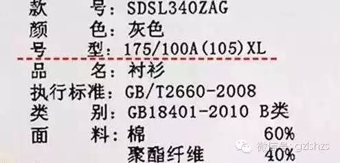 号型中没有标明身高和胸围的衣服是不合格的。合格衣服的号型标注:“175/100A”,175表示身高、100表示胸围、A表示体型。A表示“正常”,B表示“偏胖”,C表示“胖”,Y表示“偏瘦”。