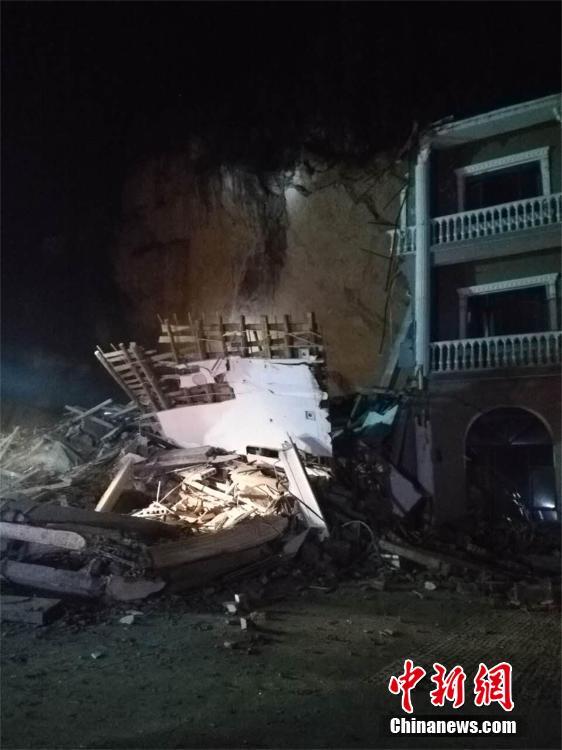 据湖北襄阳市南漳县官方消息,20日晚7时30左右,南漳县城关镇便河村三组海市蜃楼酒店背后突发山体滑坡自然灾害,将该酒店部分房屋掩埋。钟欣 摄