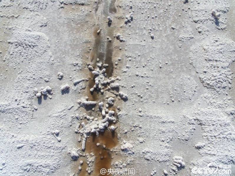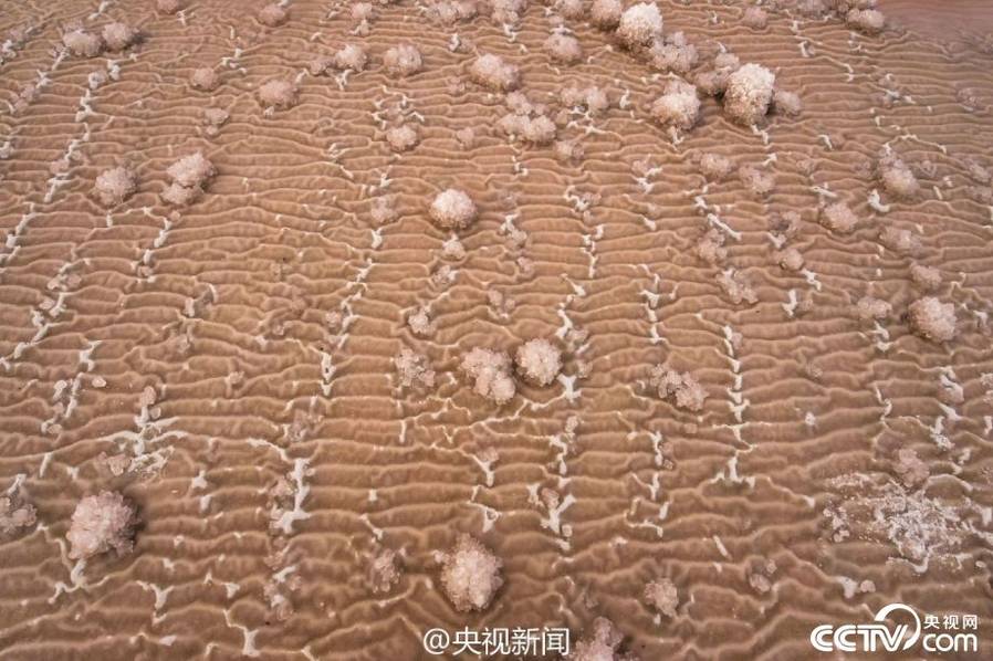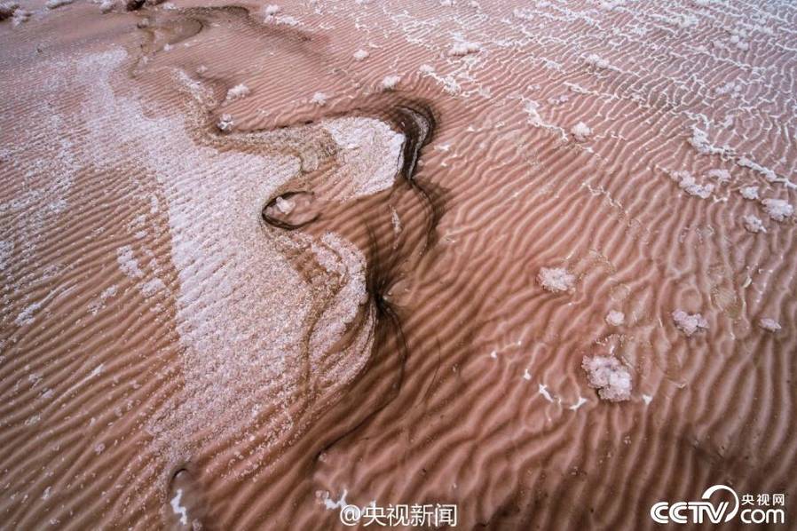 近日,气温骤降,湖水中的硫酸镁析出,形成神奇的“粉红沙漠”奇观。