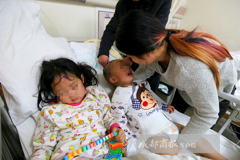 记者在医院看到,两个孩子都已经醒来,弟弟浩浩躺在床上,眼部周围还有明显淤青,两个孩子的头上都留下疤痕,孩子的母亲正在给浩浩喂饭,浩浩睁大着眼睛,一口饭也吃不下,母亲告诉记者:“我去外地打工半年多,马上春节了,我给两个孩子承诺了,等我回来,就带他们去动物园玩。出事那天,我刚好回来,结果下了飞机赶回简阳,就看到两个孩子变成了这样,弟弟甚至连‘妈妈’两个字都喊不出来。”说到这里,孩子的母亲忍不住流下了眼泪,在一旁的露露看见妈妈流泪,非常懂事地去拉拉妈妈的手,说:“妈妈别哭,我们会好的。”
