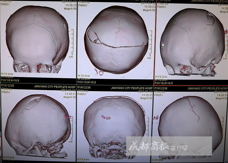 简阳市人民医院神经外科副主任医师邓增赋说,目前三人基本脱离生命危险,但两个孩子伤势严重,“两个孩子都被打成颅骨骨折,其中露露的颅骨裂缝从左右两侧太阳穴一直贯穿到头顶,所幸没有伤及脑部组织;而2岁的浩浩伤情就更加严重,1月17日他刚从ICU里转出来,由于头顶受到外力重创,伤害波及整个身体,现在浩浩右侧肢体处于瘫痪状态,同时他的脑部组织受伤面积很广,语言能力受到影响,从入院到现在,浩浩一句话也说不出来。”