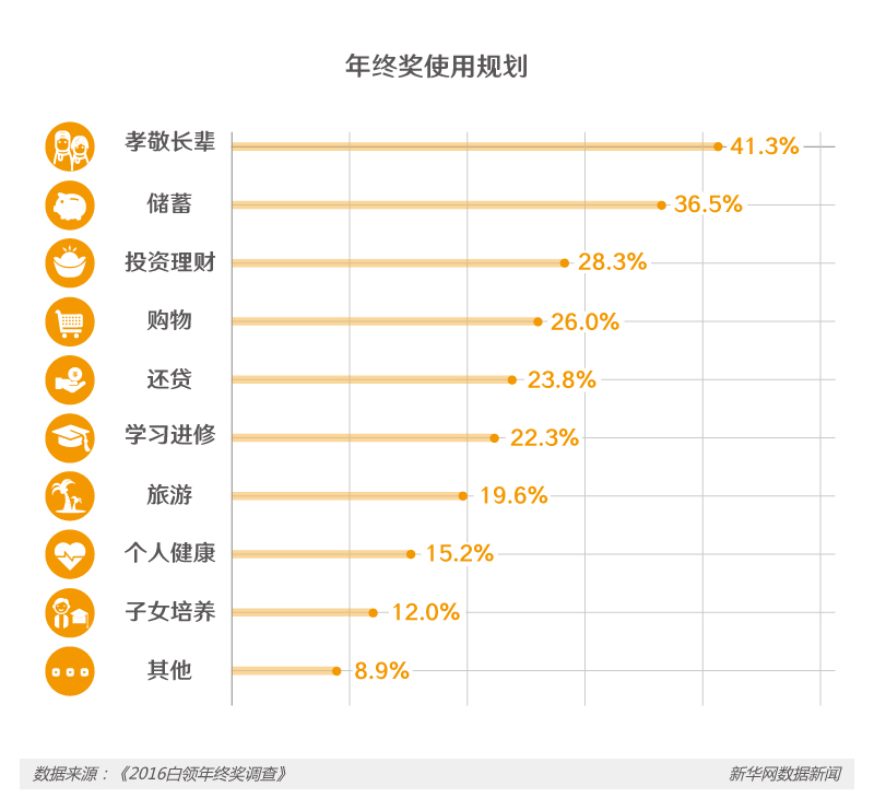 年终奖不仅是对自己的犒劳,很多人也选择借此表达对父母的一片心意。对于如何使用年终奖,超四成白领表示会用来孝敬长辈,占最大比例;其次是储蓄。
