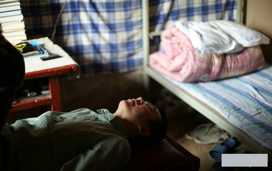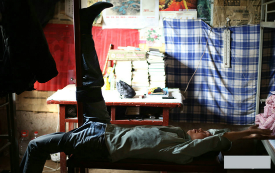 晨练完又做拉筋的小周。小周介绍,终南山上的人都知道萧宏慈,这是他全力倡导的拉筋凳。小周每次最少拉10分钟,感觉身体不舒服就练。小周说,刚拉完的时候特别麻,过一会儿就浑身轻松了。