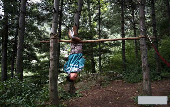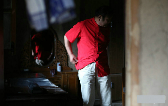 梁建平,西安人,古琴老师。2000年就上山了的梁老师说,当时向村里交了1000元的修路钱,才买了地,盖了房子,“起初条件特别艰苦,是最近三四年才接上了电。”梁老师在西安市内有房子,偶尔上山上创作,他觉得山上更有灵感。图为梁老师换好衣服,准备演奏。