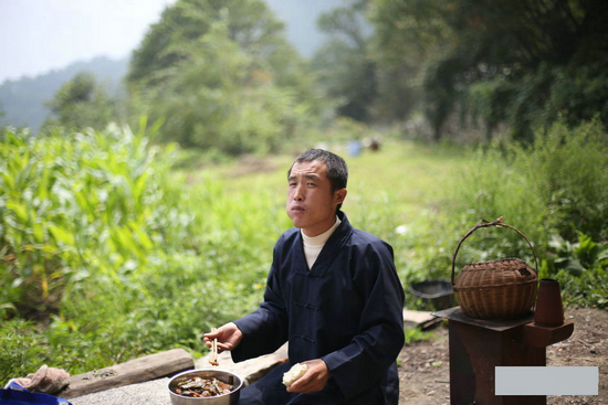 这时,一位穿道服的男子端着菜从房间走出来坐在石头上吃饭