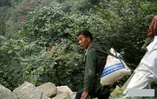 图为正在上山的一位扛沙袋的工人。简单交谈几句,他说沙子是上面盖房子人家用的,一袋50斤重,每斤2毛钱。每天来回背五六趟。