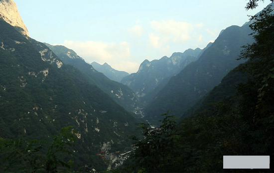 这是两名正在下山的游客站在半山腰上俯瞰整个秦岭山脉。