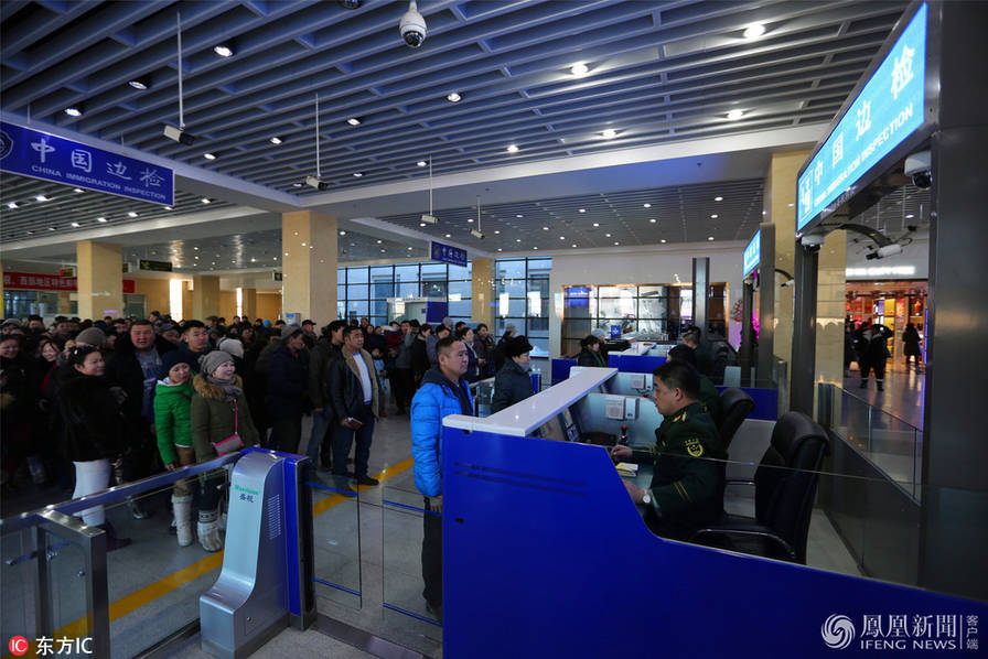 二连边防检查站检查员正在为出境旅客办理通关手续。