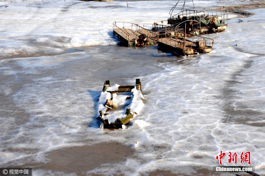 1月23日,江苏连云港西墅渔村海边的渔船被大面积的冰凌围封。连日来,江苏连云港沿海受持续低温影响,气温创新低,最低温度-7℃,海滨出现大面积凌絮景观。在连云港海岸边的沙滩和滩涂上,由海水泡沫结成的大片凌絮如同皑皑白雪般美丽,给冬日的海滨增添了别样风景。图片来源:视觉中国