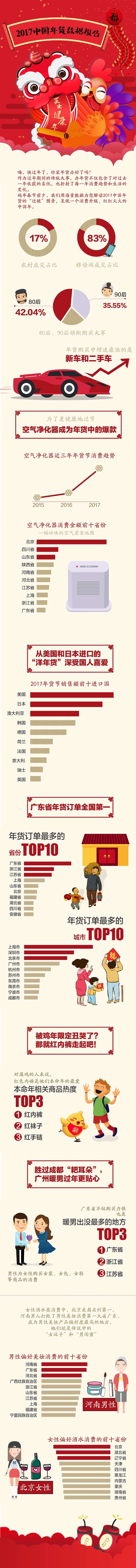 在年货构成上,吃穿用“老三样”依然是大头,家居家电、美妆饰品、娱乐服务、旅游休闲、汽车等新品类占比不断提升。尤其是汽车(新车二手车),成为鸡年春节增速最快的年货。