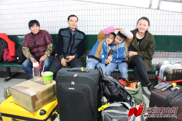 火车站候车区有专门的母婴区,提供给带小孩的乘客休息候车。来自成都的刘先生一家有一对可爱的双胞胎儿子。刘先生说,他在深圳生活已经22年了,年年春节都会回家。虽然深圳到成都的车程近30个小时,但是还是不影响回家的喜悦心情。刘先生大包小包的行李里除了基本用品外,还有不少给家里老人添置的衣服。