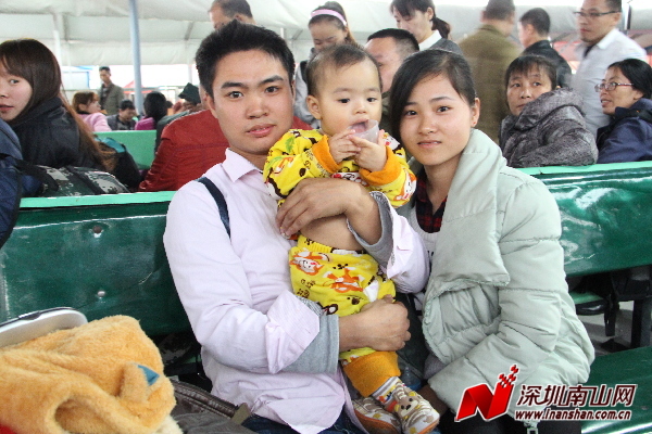 来自重庆的陶先生夫妇同样也带着自己一岁的宝宝在母婴区等车。陶先生说自己已经在深圳工作八九年了,每年春节都回老家,不过今年还是第一次带着宝宝回家去看望他的爷爷奶奶。
