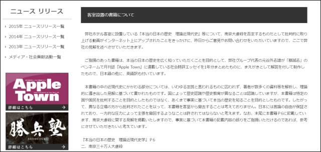 但是,这一切并没有使这家酒店有任何“纠错”行为,日本APA集团在1月17日晚间在其官网上发布公告,表示不会从客房撤下相关书籍。公告最后还颇具挑衅意味将否认南京大屠杀内容全文附上。