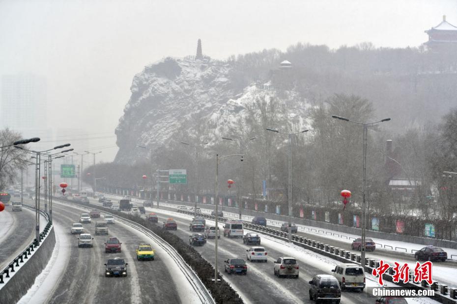 道路上车辆缓慢行进,城市建筑物已被积雪覆盖。刘新 摄