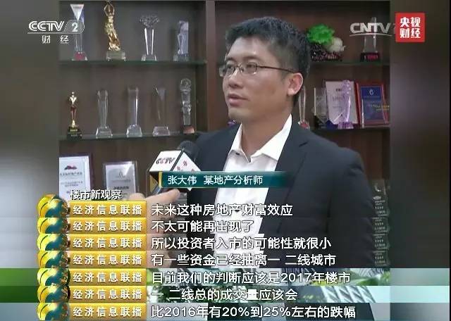 某地产分析师张大伟:未来这种房地产财富效应不太可能出现了,所以投资者入市的可能性就很小的,包括我们现在看到的一些有一些资金已经抽离一二线城市了。 目前我们的判断应该是2017年楼市,一二线总的成交量应该会比2016年有20%到25%左右的跌幅。