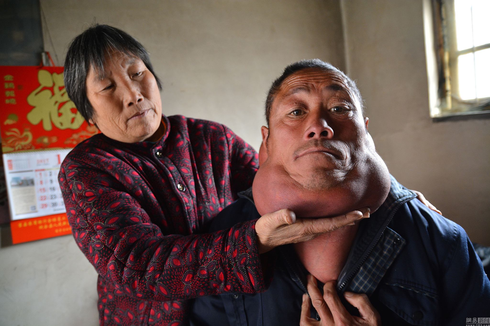 2017年2月6日,在山东省日照市莒县东莞镇大沈庄村,今年56岁的刘治河,每天都活在痛苦中。因为他的脖子比头还大,十几年来,他一边攒钱为孩子成家,一边在寻求治疗方法,但是最终都是因为承担不起治疗费用,一直这样拖着,致使现在他的脖子象充气一般,每走到一个地方,好奇的人们都会多看上两眼。据刘治河介绍,他得的是脂肪瘤病。在40岁左右的时候,脖子前面生出两个和鹌鹑蛋大小的脂肪瘤,在脖子后面也有一个。当时去沂水县的一个医院检查时,医生说这是脂肪瘤,可以手术去除,但是得需要手术费七八千块钱。当时,因为家境贫困,拿不出钱,就放弃了治疗。图/视觉中国