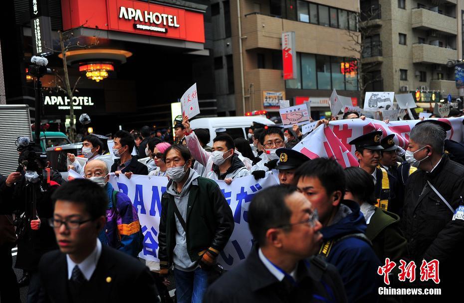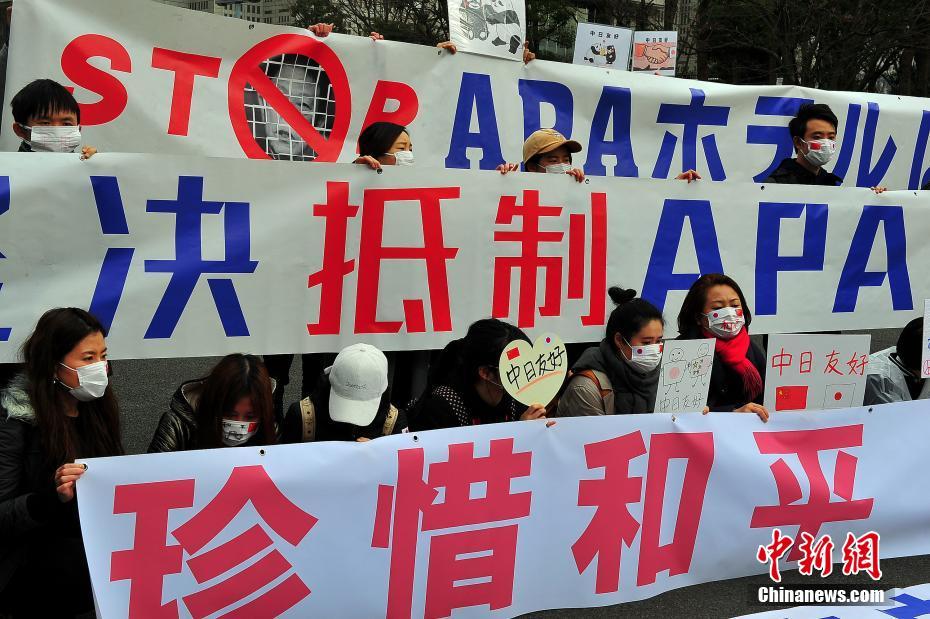 2月5日下午,近百名在日华侨华人和中国留学生在东京举行了抗议APA酒店的和平游行活动,抗议APA酒店长期在所有客房中放置由该集团老板元谷外志雄撰写的否认、歪曲历史的右翼书籍。中新社记者王健 摄