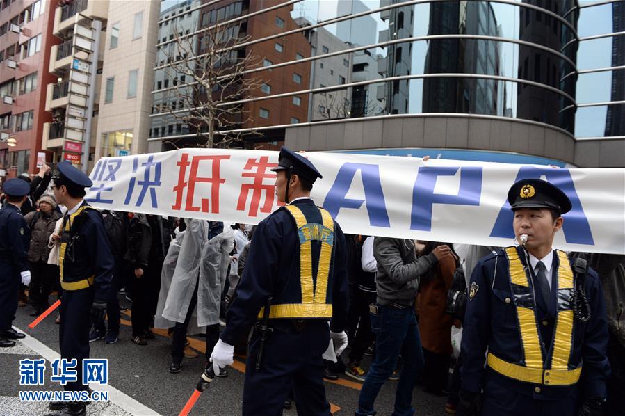 2月5日,在日本东京新宿,在日华侨华人手举标语走过APA酒店。近百名在日华侨华人当日在东京举行了抗议APA酒店的和平游行活动。新华社记者马平摄