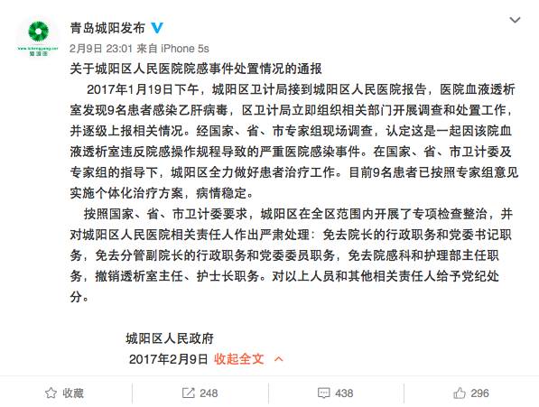 2月9日,23时01分,青岛市城阳区人民政府新闻办公室官方微博@青岛城阳发布公布了《关于城阳区人民医院院感事件处置情况的通报》。通报称,医院血液透析室发现9名患者感染乙肝病 毒,经国家、省、市专家组现场调查,认定这是一起因该院血液透析室违反院感操作规程导致的严重医院感染事件。目前9名患者已按照专家组意见实施个体化治疗方案,病情稳定。院长等多人被免职。