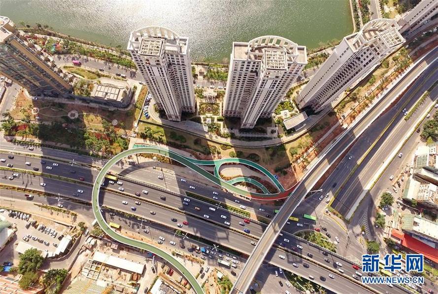 2017年2月9日报道,图为2月9日航拍的厦门市湖里区云顶中路和仙岳路交叉口的空中自行车道。1月26日,全国首条空中自行车道——厦门云顶路自行车快速道示范段试运营,这条全程高架的空中自行车道全长7.6公里。