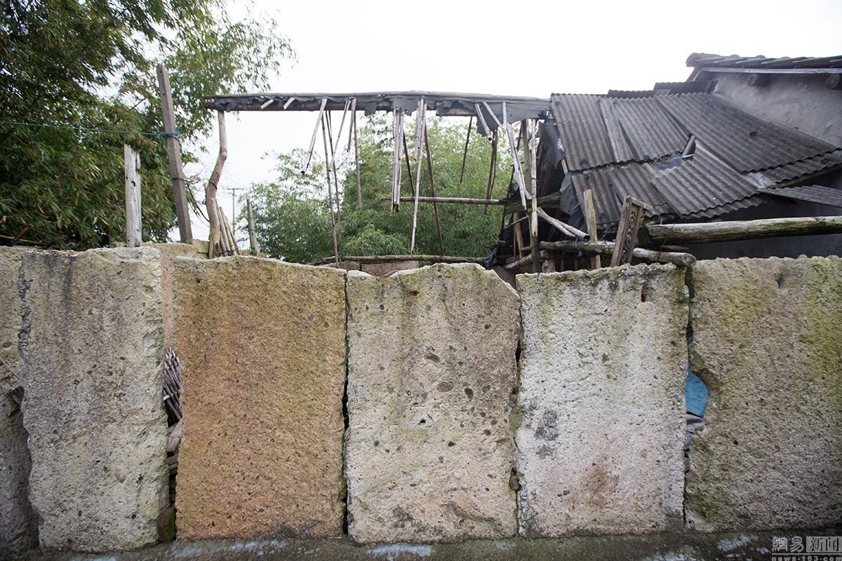 2017年2月5日,浙江省上虞市沥海镇四联村,走在路上,随处可见这种不同寻常的房子。这些房子破旧不堪,基本只剩房子的“框架”。这是用墓碑做的房子,有的墓碑刻着“民国”、“清”等字样的碑文,看来距今至少已有100多年。
