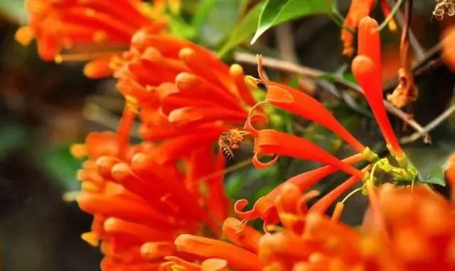 炮仗花的花期是1月至6月,橙红色的花朵一串串攀爬在周围的绿树之间,就像一串串炸开了的鞭炮似的,满眼金红色,美不胜收!